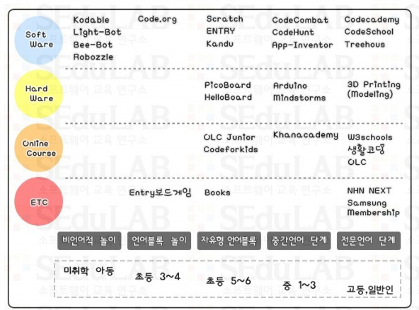 - 스크래치(Scratch) : 아이들도 그림 블록을 끌어다 놓기만 하면 코딩 원리를 배울 수 있는 도구입니다.